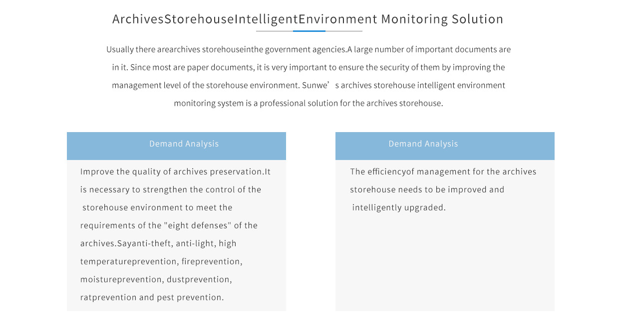 Usually there arearchives storehouse in the government agencies.A large number of important documents are in it. Since most are paper documents, it is very important to ensure the security of them by improving the management level of the storehouse environment. Sunwe’s archives storehouse intelligent environment monitoring system is a professional solution for the archives storehouse.